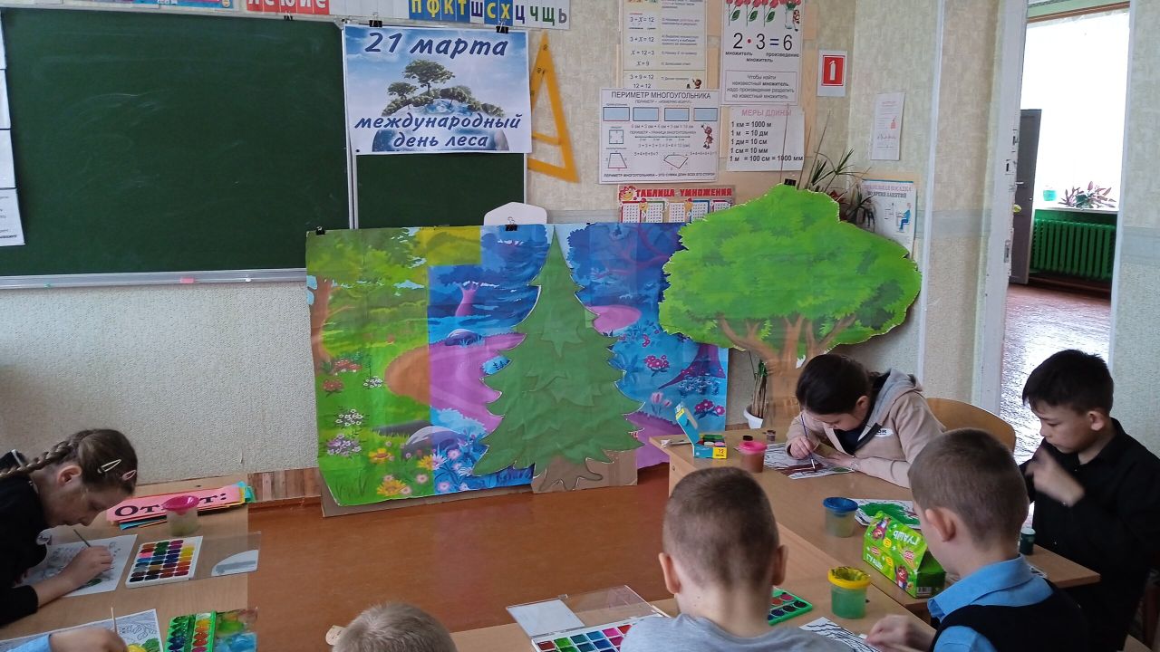 Учитель начальных классов Ильяшова Т.Ю. 19 марта провела занятие для учеников 2-3 классов, рассказав им об истории праздника, его мероприятиях и интересных фактах, связанных с лесами. Проведён мастер-класс аппликаций по теме "День леса".
